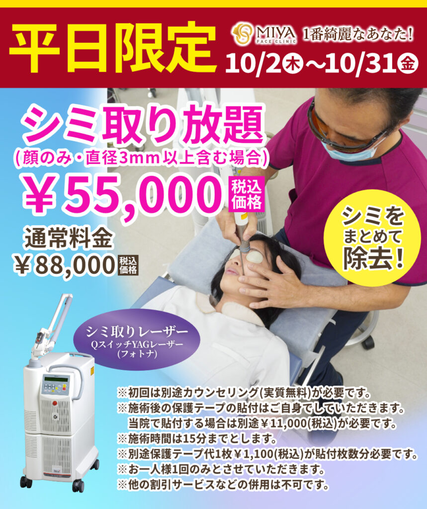 シミ取り放題(顔のみ)※直径3㎝以上含む場合 通常価格¥88000(税込)を平日特別価格¥55000(税込)でご提供!