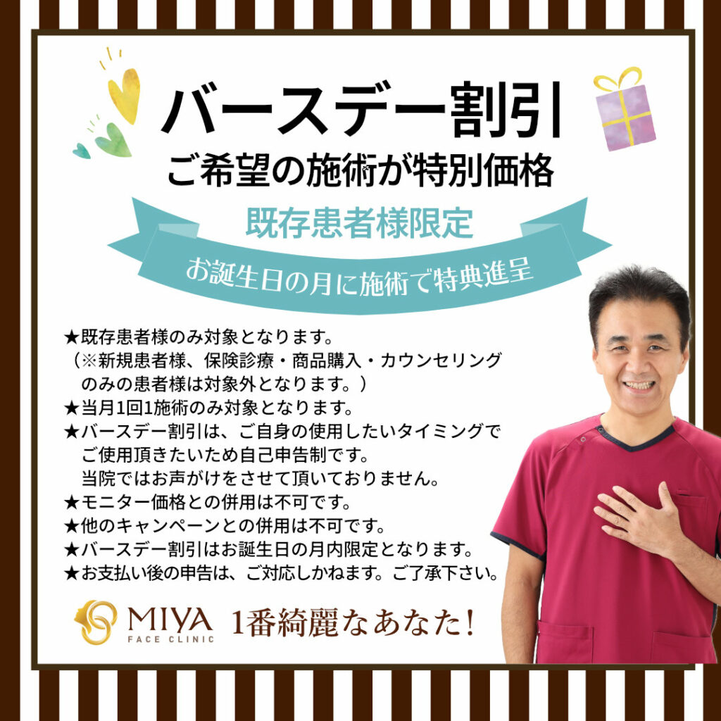 ※バースデー割引は、ご自身の使用したいタイミングでご使用頂きたいため自己申告制です。当院ではお声がけをさせて頂いておりません。