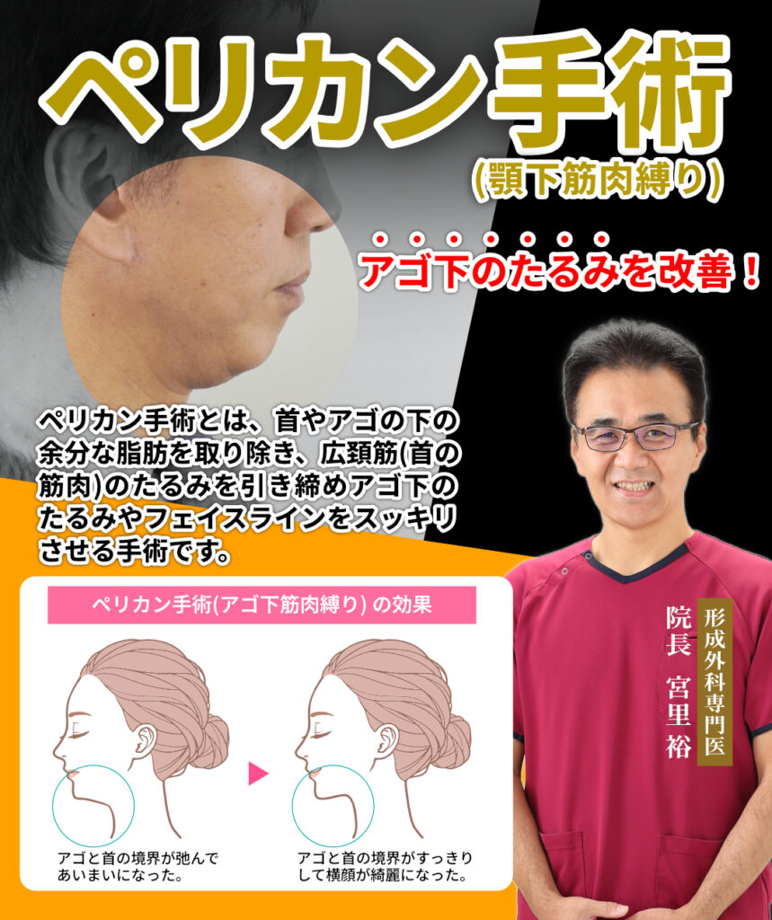 ペリカン手術とは、首や顎の下の余分な脂肪を取り除き、広頚筋(首の筋肉)のたるみを引き締め、アゴ下のたるみフェイスラインをスッキリさせる手術です。 加齢などにより広頚筋ゆるみ、ペリカンの下くちばしが垂れ下がっている形状に似ていることから通称「 ペリカン手術 」と呼ばれます。
