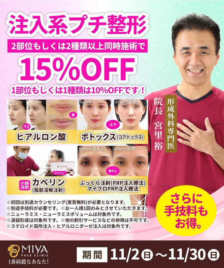 注入系プチ整形(ヒアルロン酸・ボトックス・カベリン・ふっくら注射)が2部位もしくは2種類以上同時施術で15%OFFで超お得!