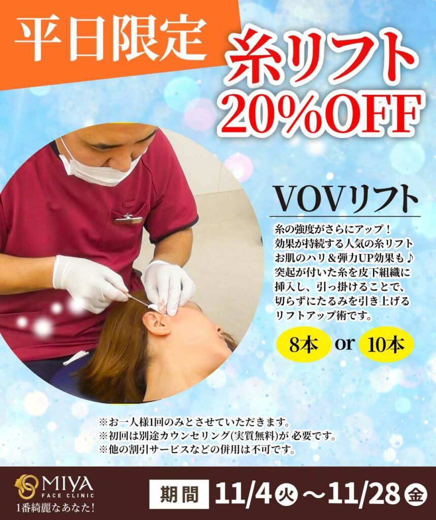 平日限定!糸リフト(VOVリフト8本or10本)の施術料金が20%OFF!