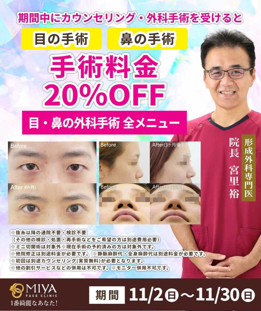 期間中に目・鼻の外科手術のカウンセリングを受けられて手術を受けられると施術料が20%OFF!