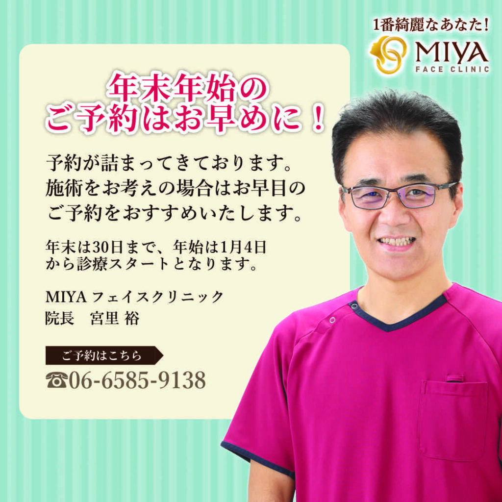 ご予約は年末年始にかけてご予約が集中して埋まって参りますので、カウンセリングや施術をお考えの方はなるべくお早めのご予約をおすすめします。
