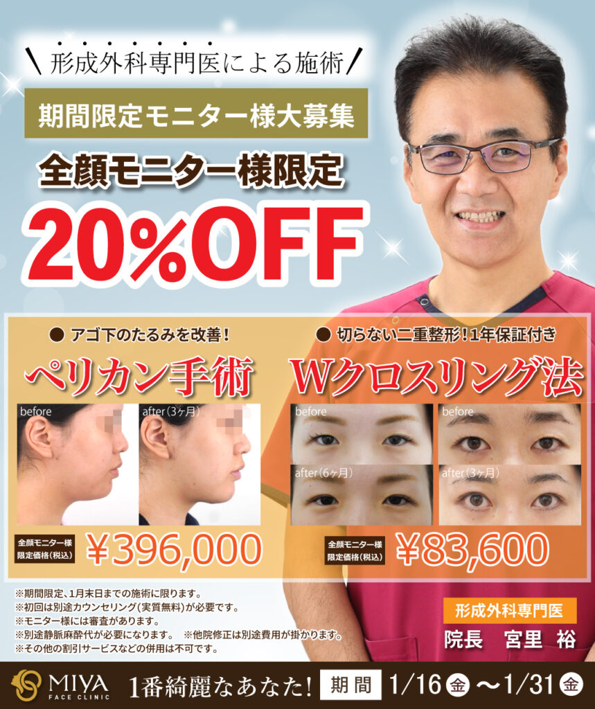 1/16日(金)~1/31(金)まで「ペリカン手術」「Wクロスリング法」の全顔モニター様が特別価格20%OFFになる大変お得な企画です!