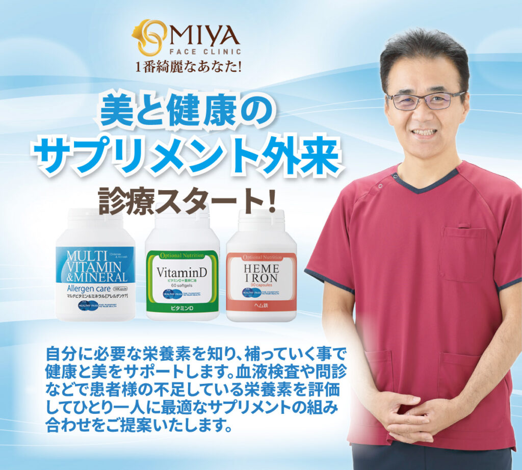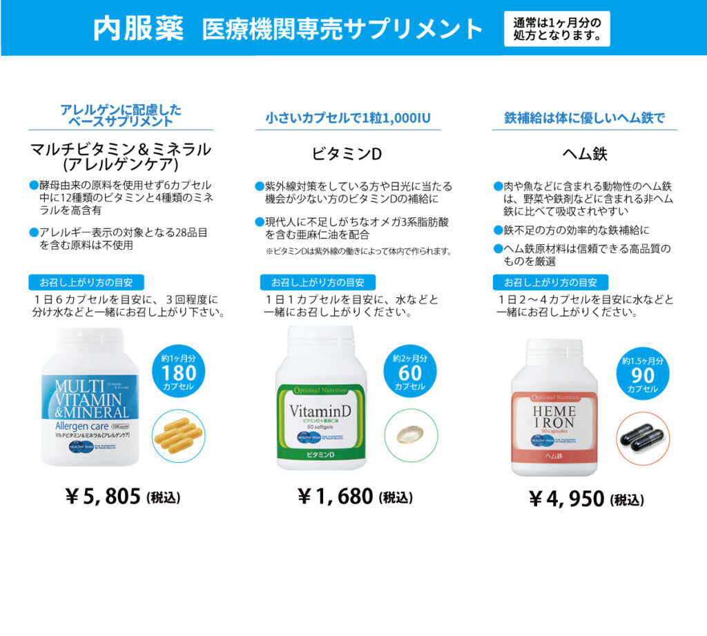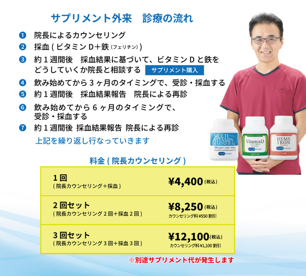 血液検査や問診などで不足しがちな栄養素(ビタミンD・鉄(フェリチン))を評価して患者様ひとり一人に最適なサプリメントの組み合わせをご提案いたします。